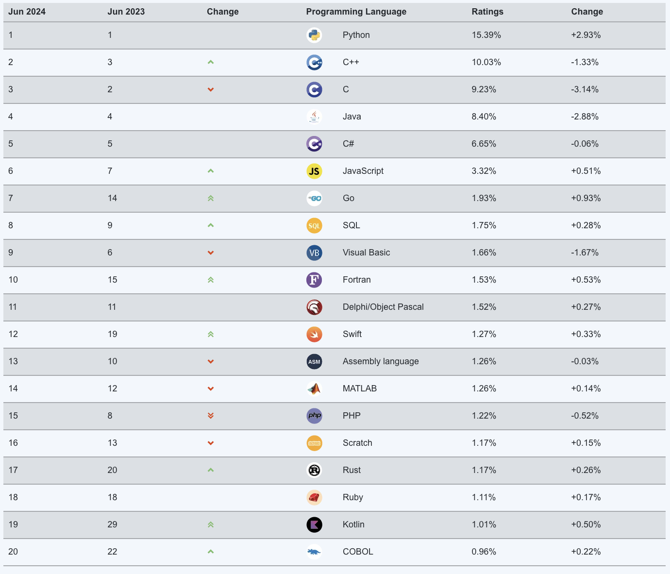 TIOBE 编程社区指数是一个衡量编程语言受欢迎程度的指标,评判的依据来自世界范围内的工程师、课程、供应商及搜索引擎,今天 TIOBE 官网公布了 2024 年 6 月的编程语言排行榜。