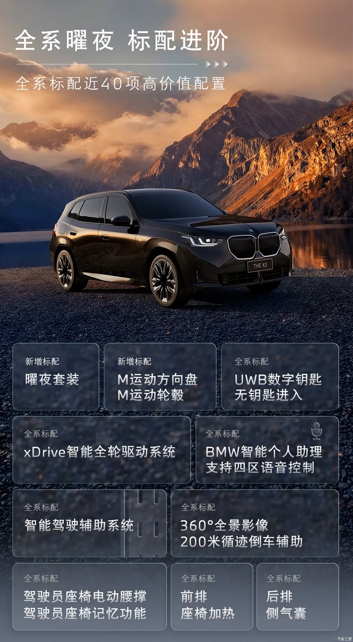 新款宝马X3则会全系标配曜夜套装、M运动方向盘、M运动轮圈、前排座椅加热、驾驶员座椅电动腰撑+记忆、5G网络能力、四音区智能语音、后排气囊、360°全景影像+200米循迹倒车辅助以及智能驾驶辅助系统等;中配车型增加HUD全彩平视系统;顶配车型提供免费选装磨砂灰色车漆和21英寸个性化轮圈。
