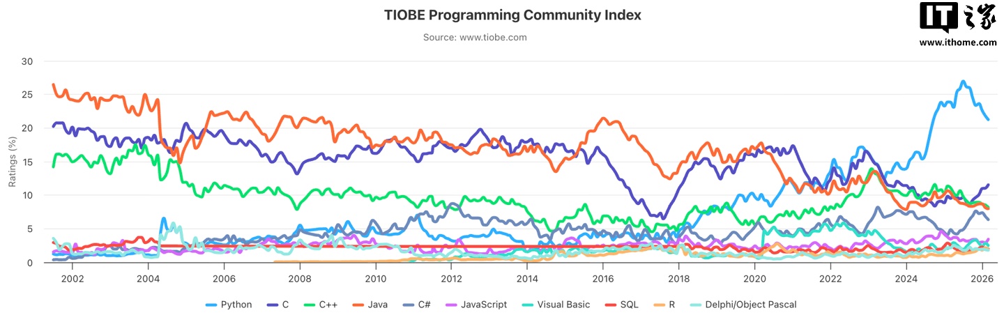 3 月 9 日消息,TIOBE编程社区指数是一个衡量编程语言受欢迎程度的指标,评判的依据来自世界范围内的工程师、课程、供应商及搜索引擎,目前TIOBE官网公布了2026年3月的编程语言排行榜。