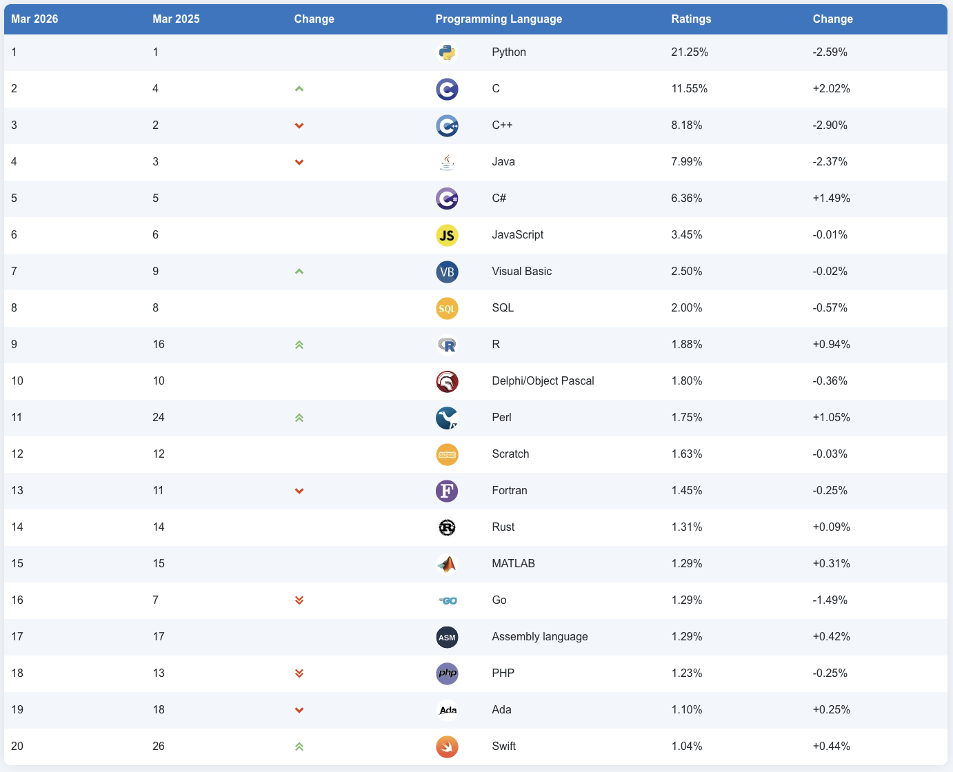 TIOBE编程社区指数是一个衡量编程语言受欢迎程度的指标,评判的依据来自世界范围内的工程师、课程、供应商及搜索引擎,目前TIOBE官网公布了2026年3月的编程语言排行榜。