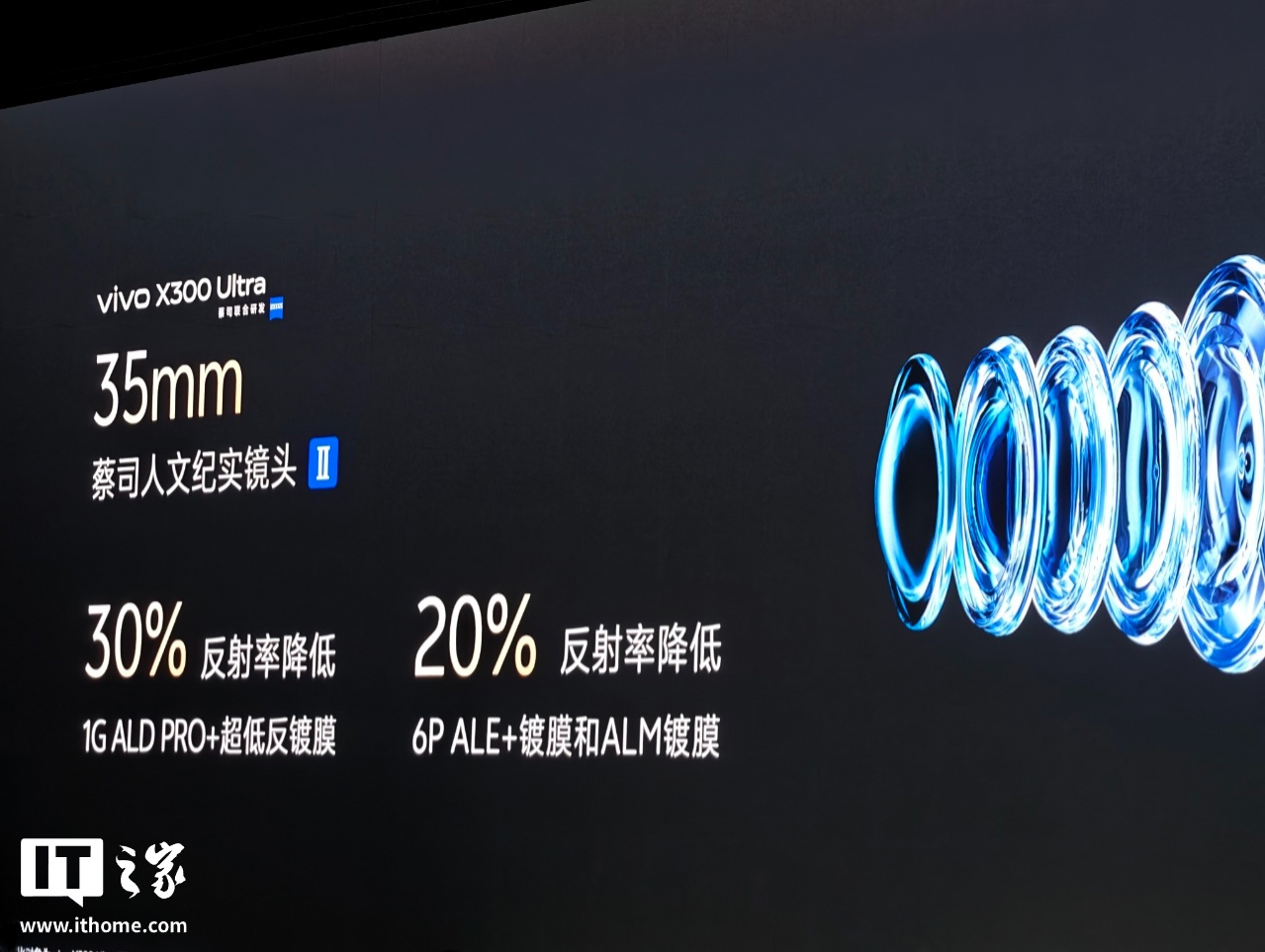 vivo X300 Ultra 还后置一枚 2 亿像素 35mm 蔡司人文纪实镜头 II,采用蓝图 × 索尼 LYTIA 901 传感器(1/1.12 英寸超大底)+ 蔡司 T* 镀膜,支持 f/1.85、原生 35mm 光学直出,配备 1G+6P 镜片结构: 1G ALD PRO + 超低反镀膜,反射率降低 30%;6P ALE + 镀膜和 ALM 镀膜,反射率降低 20%。